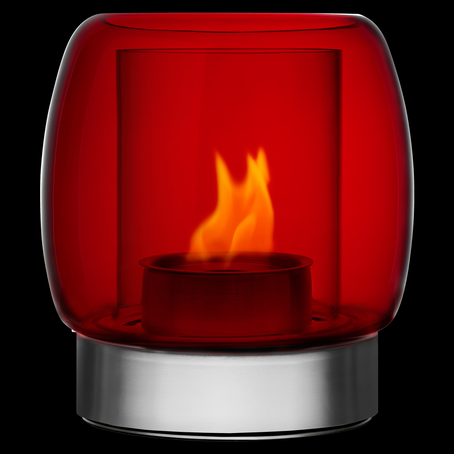Der Designer hat feuerfestes, rotes Glas und Metall kombiniert, um einem offenen Feuer das moderne gewisse Etwas zu verleihen und hat eine Möglichkeit geschaffen, die Gemütlichkeit des offenen Feuers in die HÃ