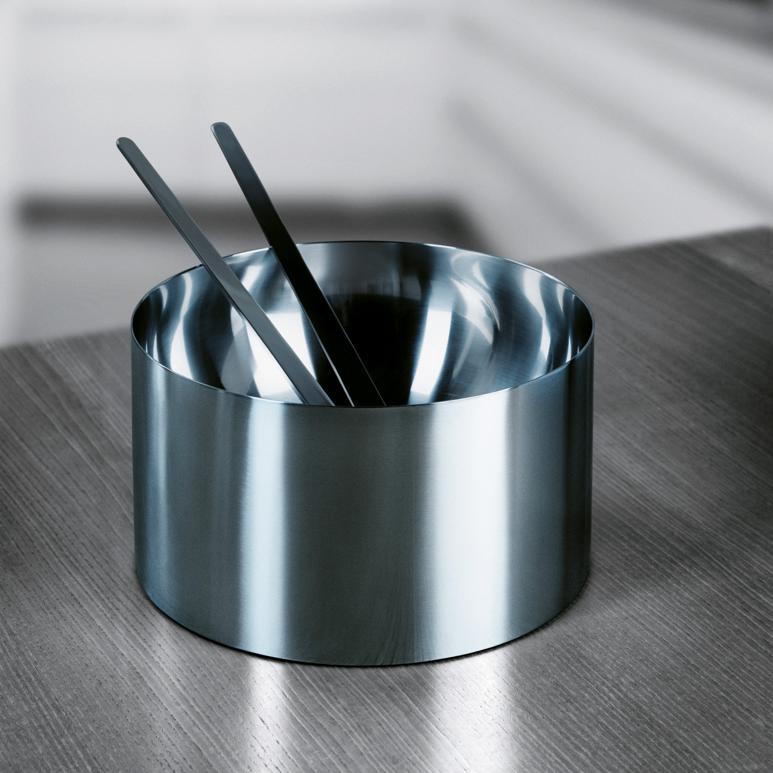 Die Salatschüssel aus gebürstetem Edelstahl hat eine halbkugelförmige Vertiefung.