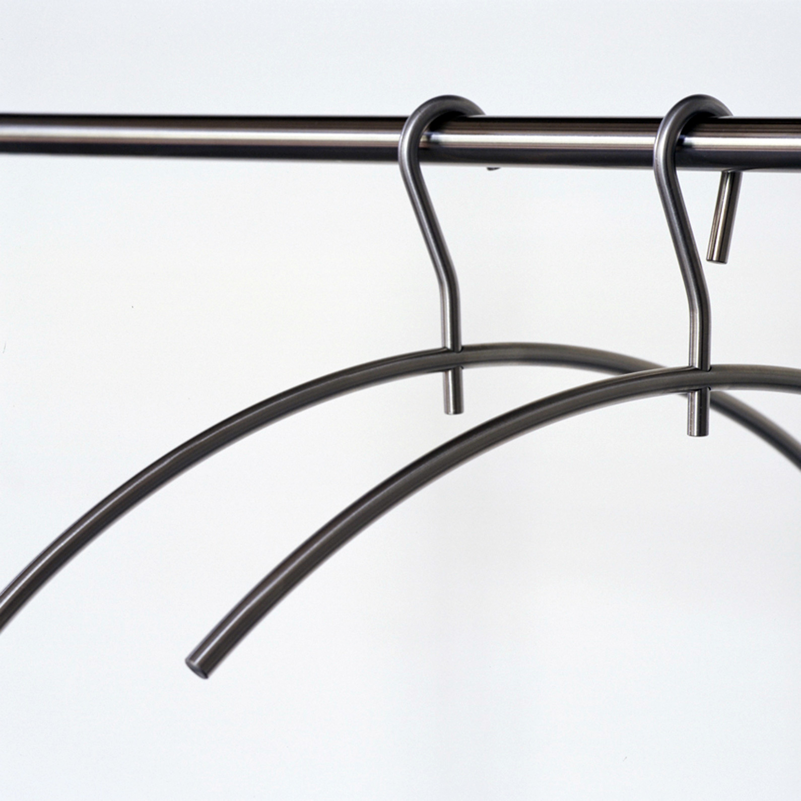 Der Kleiderbügel ist aus einer 10mm dicken Edelstahlstange gefertigt und besitzt einen geschlossenen, drehbaren Haken. Man kann ihn auf Garderobestangen auffädeln, sodass er nicht entwendet werden kann.