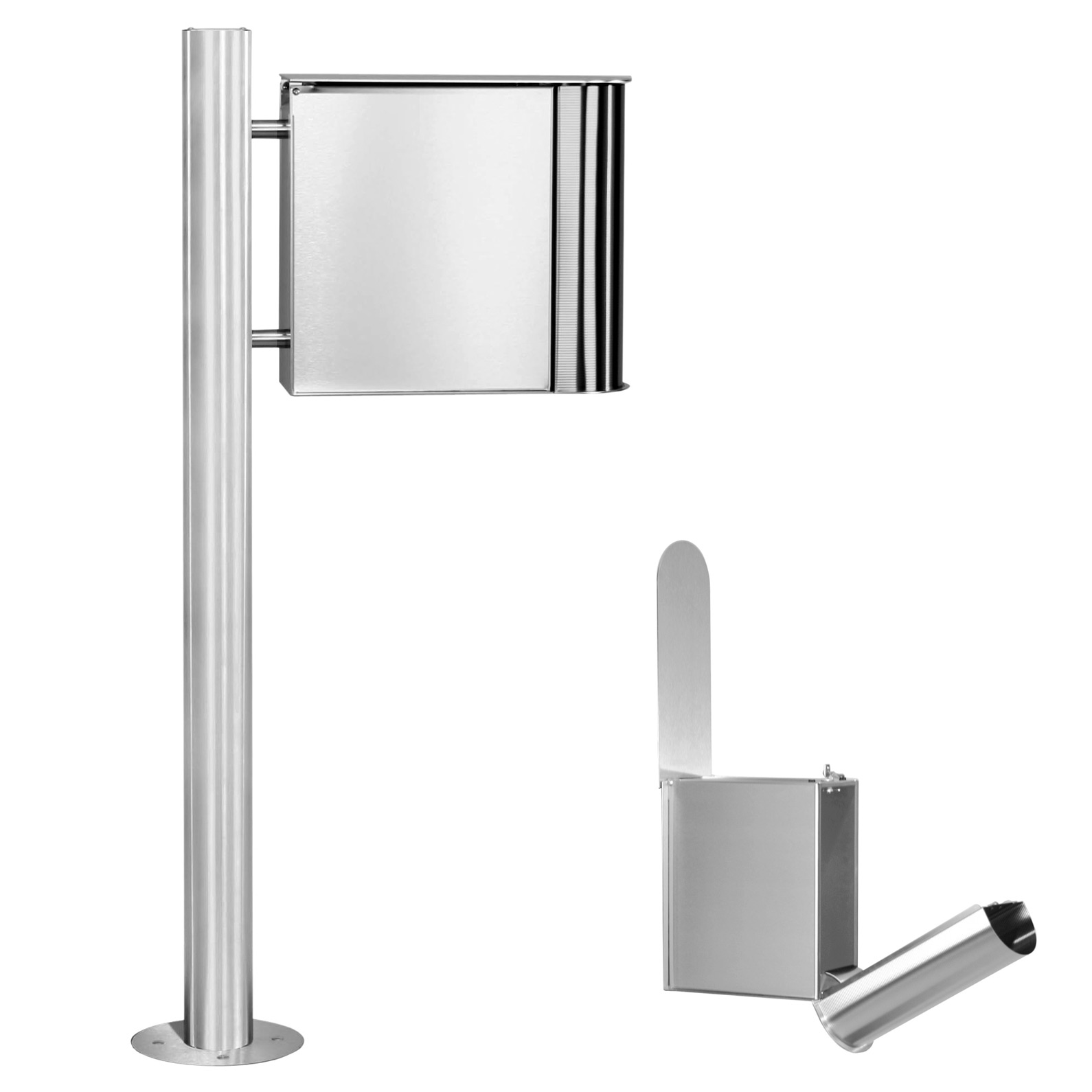 Der Edelstahl-Briefkasten mit integriertem Zeitungsfach ist auf einem Standrohr montiert und bietet viele Einsatzmöglichkeiten, wenn keine Wand zur Montage verfügbar ist. Das wandmontierte Modell 91001-072 kostet € 779,00.